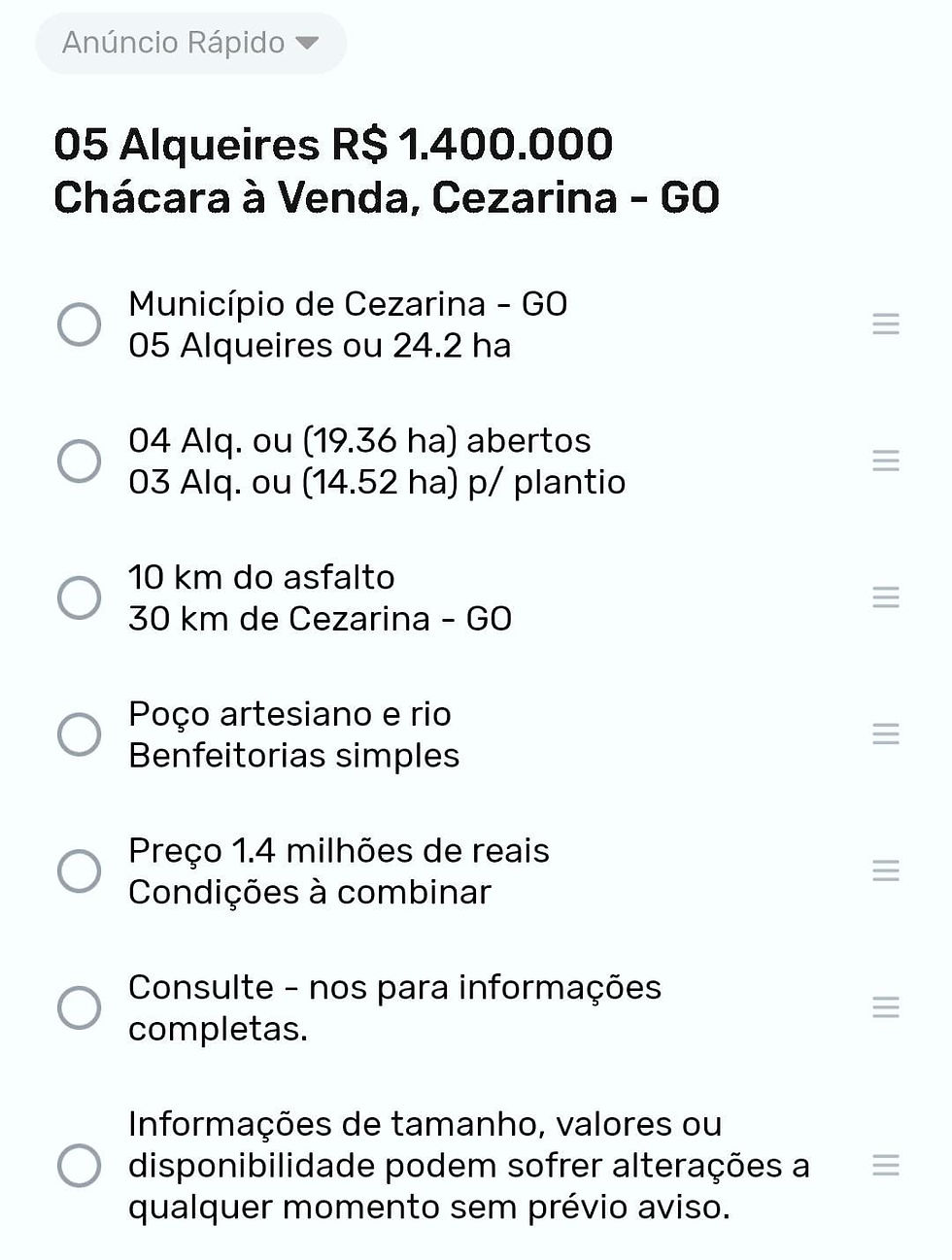 05 Alqueires ou 24.2 haWV Negócios21 de fev. de 20241 min de leituraR$ 1.400.000 Chácara à Venda, Cezarina - GOhttps://video.wixstatic.com/video/18992a_9c67e30996a14b619ccfeaa3af0a2069/480p/mp4/file.mp4https://video.wixstatic.com/video/18992a_b37421a965954faeaa6a5393efa4e7d6/480p/mp4/file.mp4https://video.wixstatic.com/video/18992a_1a058dbd5dfe40fab0b11576aad58ddf/480p/mp4/file.mp4https://video.wixstatic.com/video/18992a_9c4aff31f50e4a06a9d20c748886fea0/480p/mp4/file.mp4