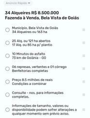 34 Alqueires ou 163 haWV Negócios10 de mai. de 20241 min de leitura R$ 8.500.000 Fazenda à Venda, Bela Vista de Goiás